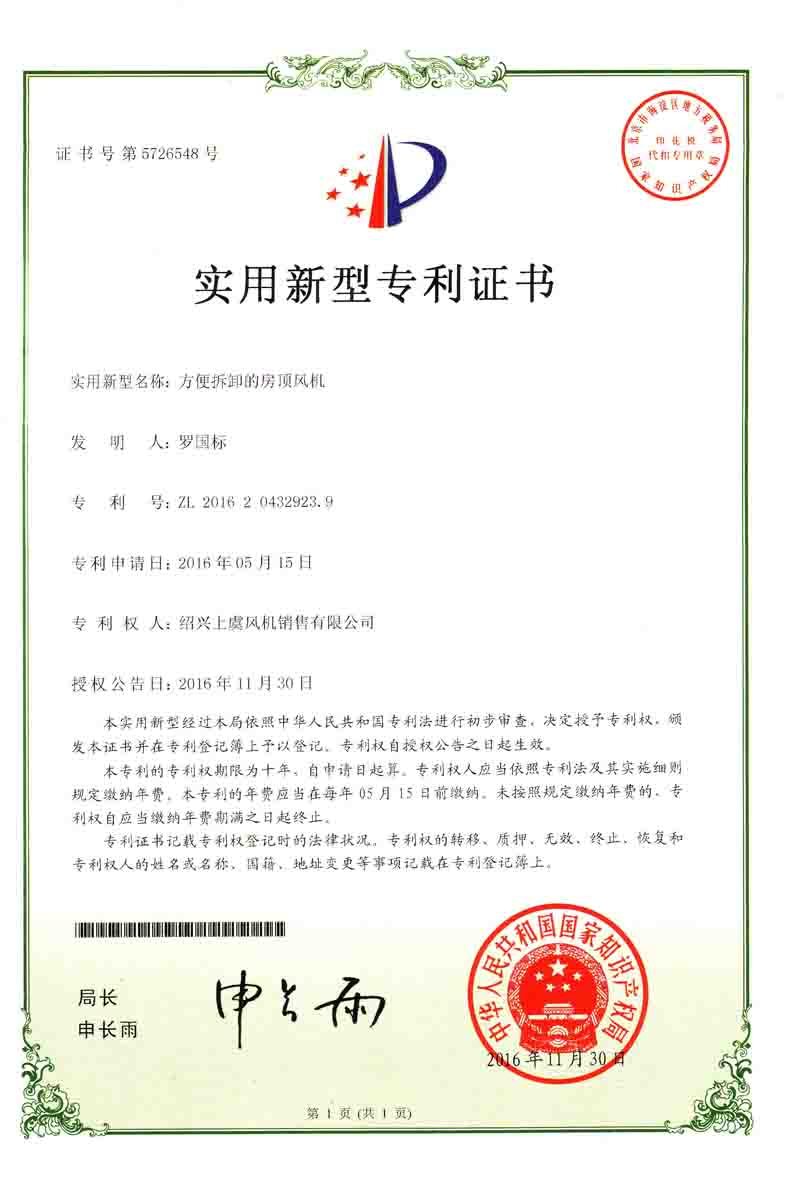 方便拆卸的房頂風(fēng)機(jī)專利證書(shū) |