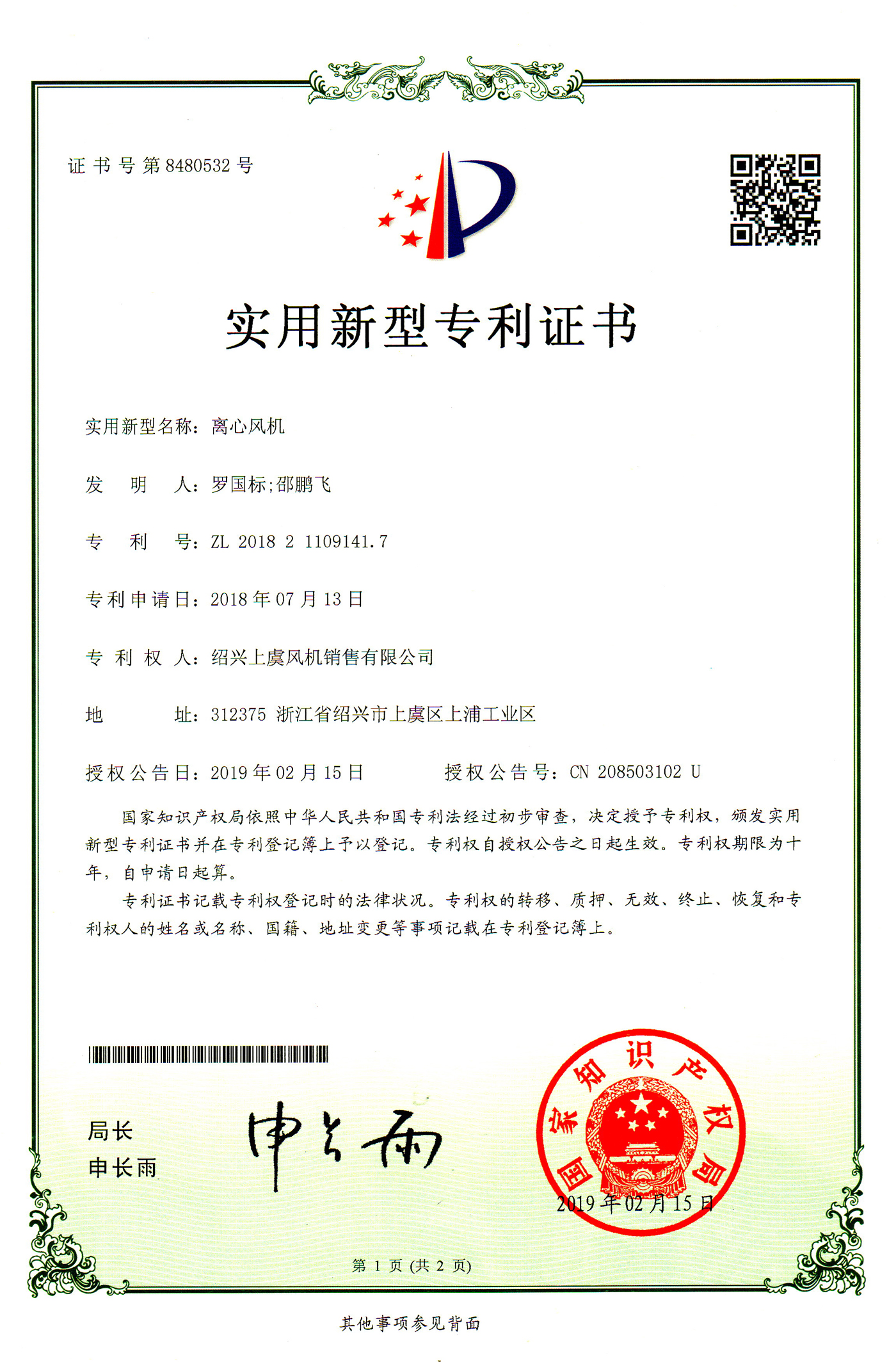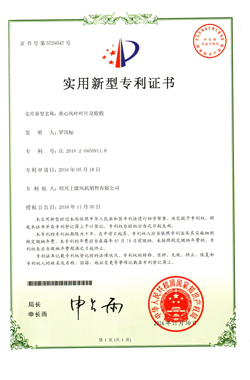 離心風(fēng)機(jī)葉片及輪轂專利證書(shū) |