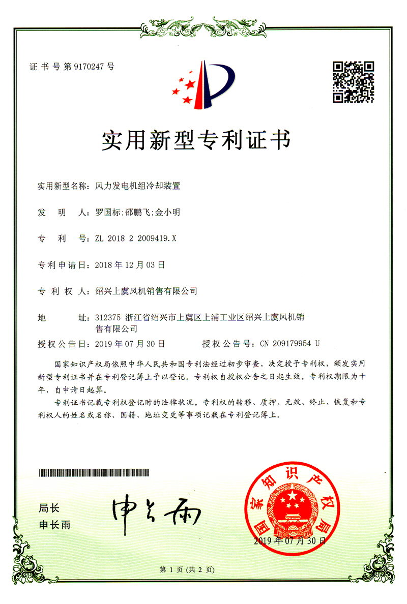 風(fēng)力發(fā)電機(jī)足冷卻裝置專利證書(shū) |